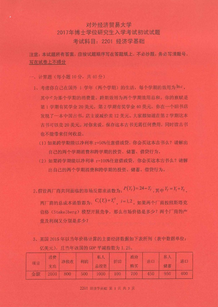 对外经济贸易大学2017,2015-2004经济学基础与数学考博真题(42)