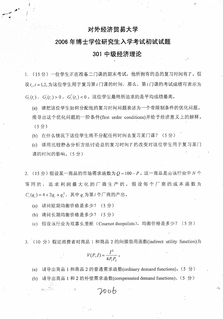 对外经济贸易大学2017,2015-2004经济学基础与数学考博真题(5)