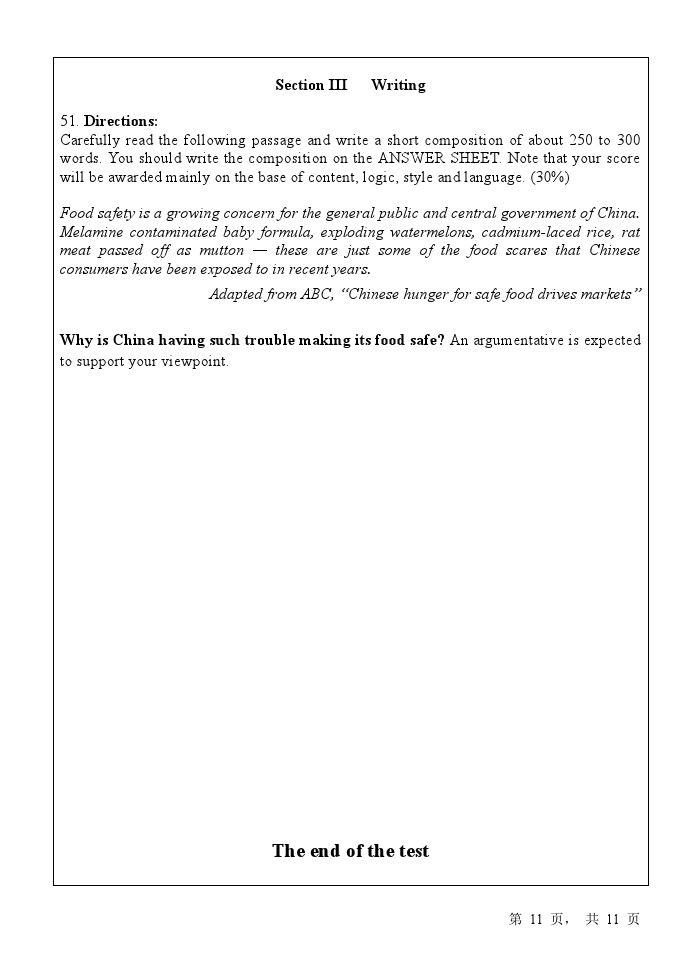 ㈠基础英语: 20个单选,几乎都是词汇辨析,难度适中,撑死专八难度,比如说euphoria/rapture,customary/cumstom/accustomed 完形填空(20个) 2篇阅读,专八难度 一段英译汉 一段汉译英 作文 北大学生毕业后选择卖猪肉,有人认为他这么做是浪费了他在名校所享受到的资源,有人支持他的选择。你的看法 ㈡大综合: ● ...