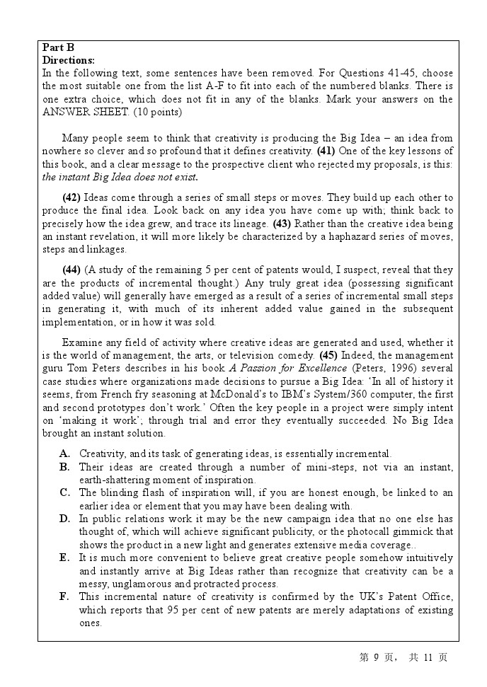 ㈠基础英语: 20个单选,几乎都是词汇辨析,难度适中,撑死专八难度,比如说euphoria/rapture,customary/cumstom/accustomed 完形填空(20个) 2篇阅读,专八难度 一段英译汉 一段汉译英 作文 北大学生毕业后选择卖猪肉,有人认为他这么做是浪费了他在名校所享受到的资源,有人支持他的选择。你的看法 ㈡大综合: ● ...