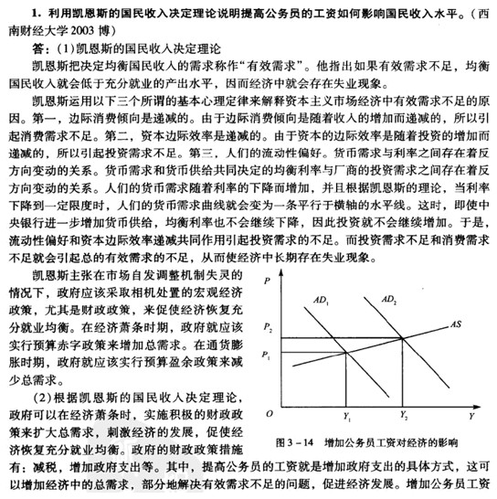 (2)托宾的q理论是美国经济学家詹姆斯•托宾提出的股票价格会影响企业投资的理论。按他的说法,企业的市场价值与其重置成本之比,可作为衡量要不要进行新投资的标准,他把此比率称为"q"。企业的市场价值就是这个企业的股票的市场价格总额,它等于每股的价格与总股数之积。企业的重置成本指建造这个企业所需要的成本。因此,q=企业的股票市场价值/新建造企业的成本。如果企业的市场价值小于新建造成本时,q<1,说明买旧的企业比新建设便宜,于是就不会有投资,相反,q>1时,说明新建造企业比买旧企业要便宜,因此会有新投资。就是说,当q较高时,投资需求会较大。托宾这种"q"说,实际对经济的影响如图3-14所示。在短期内价格水平较为稳定,增加公务员工资会使总需求由AD,右移至AD,,价格水平由P,上升为P2,但是产出由Y,增加到Y2