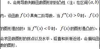 | 二、一元函数微分学 | 考试内容 导数和微分的概念 导数的几何意义和物理意义 函数的可导性与连续性之间的关系 平面曲线的切线和法线 导数和微分的四则运算 基本初等函数的导数 复合函数、反函数、隐函数以及参数方程所确定的函数的微分法 高阶导数 一阶微分形式的不变性 微分中值定理 洛必达(L’Hospital)法则 函数单调性的判别 函数的极值 函数图形的凹凸性、拐点及渐近线 函数图形的描绘 函数的最大值与最小值 弧微分 曲率的概念 曲率圆与曲率半径 考试要求 1.理解导数和微分的概念,理解导数与微分的关系,理解导数的几何意义,会求平面曲线的切线方程和法线方程,了解导数的物理意义,会用导数描述一些物理量,理解函数的可导性与连续性之间的关系. 2.掌握导数的四则运算法则和复合函数的求导法则,掌握基本初等函数的导数公式.了解微分的四则运算法则和一阶微分形式的不变性,会求函数的微分. 3.了解高阶导数的概念,会求简单函数的高阶导数. 4.会求分段函数的导数,会求隐函数和由参数方程所确定的函数以及反函数的导数. 5.理解并会用罗尔(Rolle)定理、拉格朗日(Lagrange)中值定理和泰勒(Taylor)定理,了解并会用柯西(Cauchy)中值定理. 6.掌握用洛必达法则求未定式极限的方法. 7.理解函数的极值概念,掌握用导数判断函数的单调性和求函数极值的方法,掌握函数最大值和最小值的求法及其应用. ![]() 9.了解曲率、曲率圆与曲率半径的概念,会计算曲率和曲率半径. |