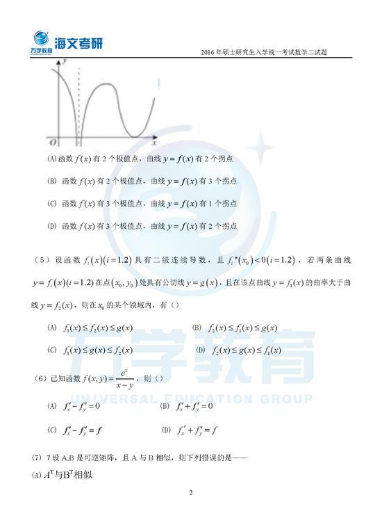 2016年考研初试数学(二)真题