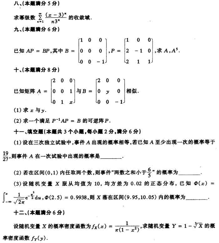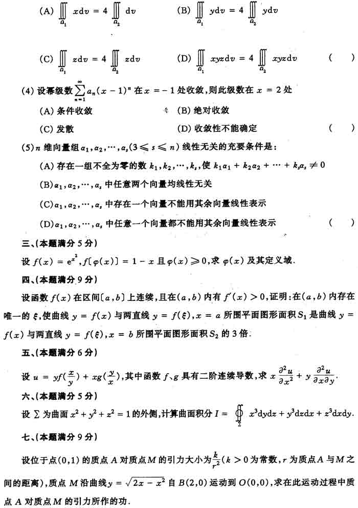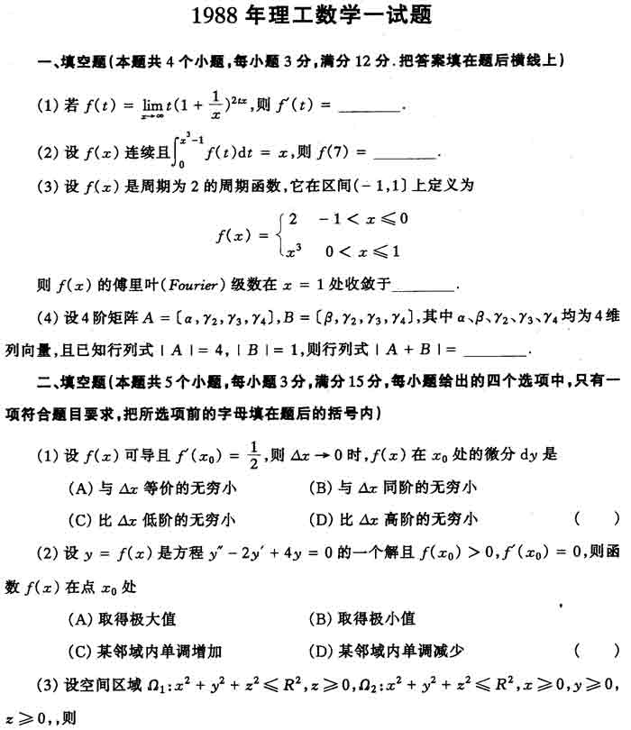 1988年全国硕士研究生入学考试数学一试卷