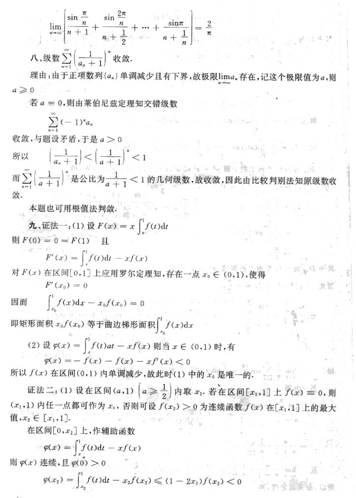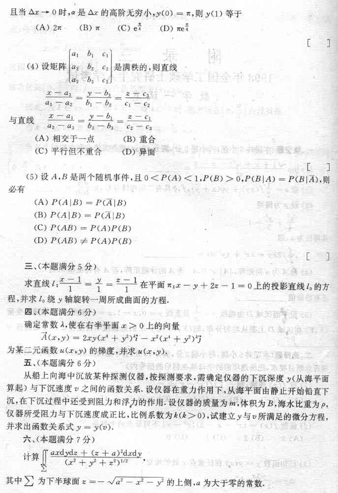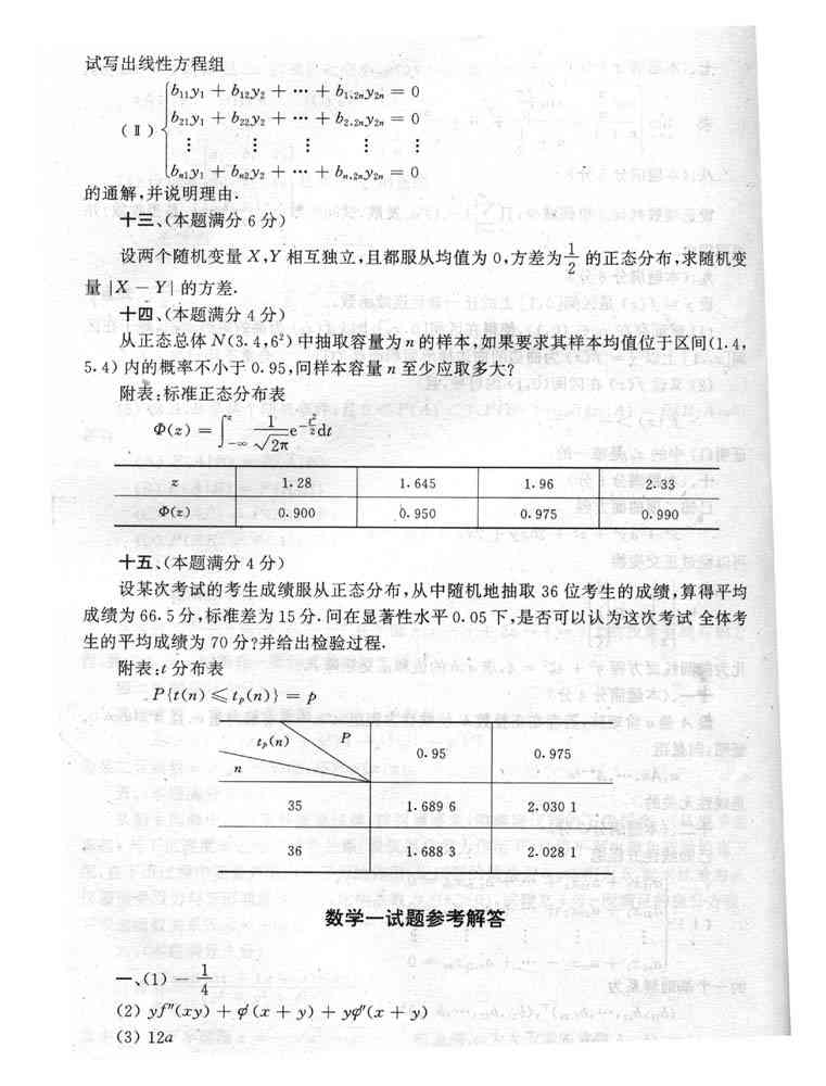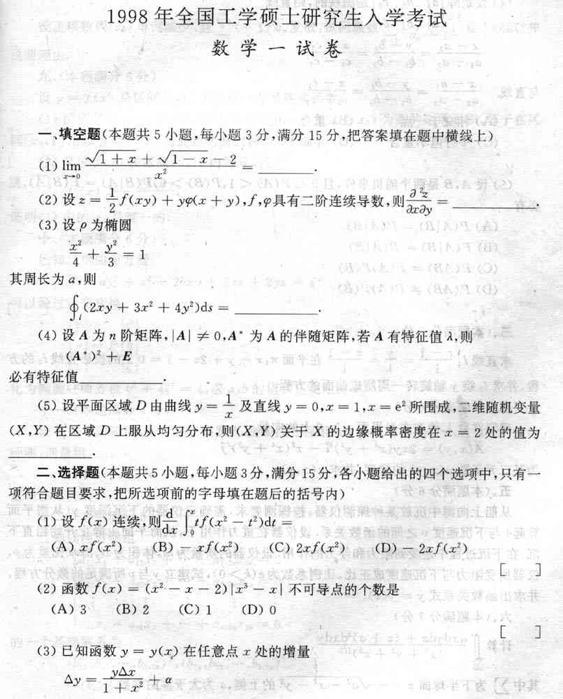 1998年全国硕士研究生入学考试数学一试卷附标准答案