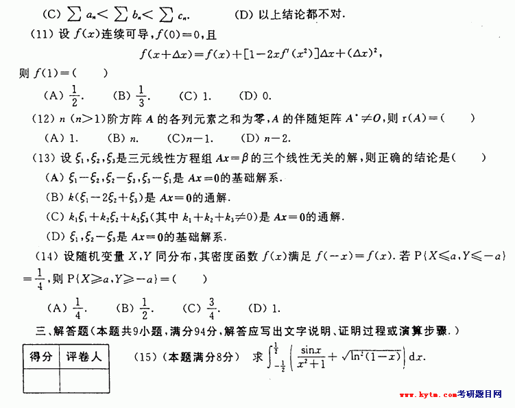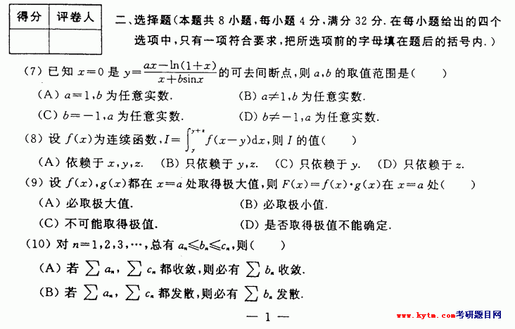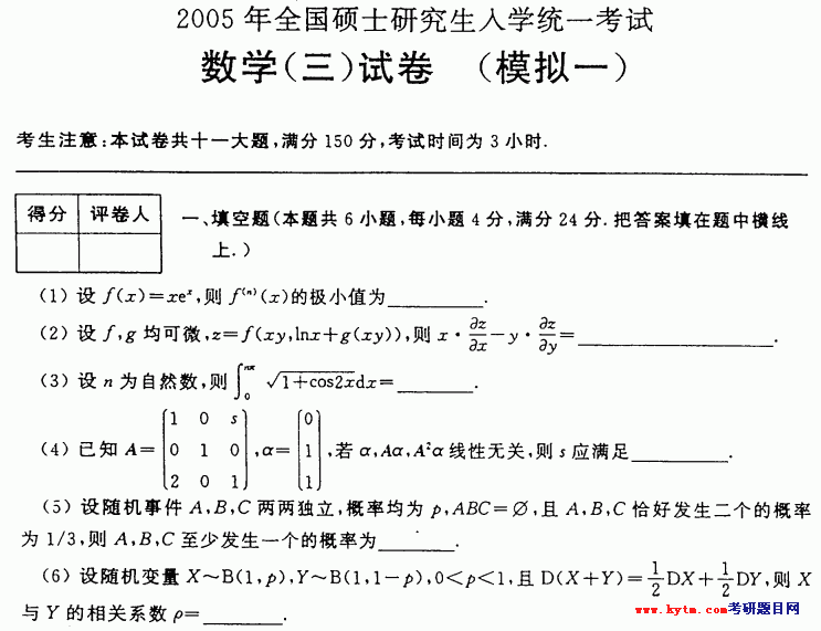 2005年合肥工业大学数学模拟试题数学三试题第一集