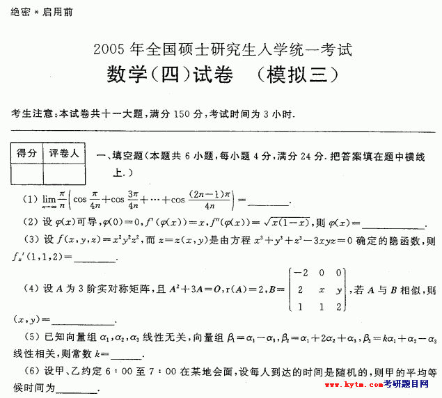 2005年合肥工业大学数学模拟试题数学四试题第三集