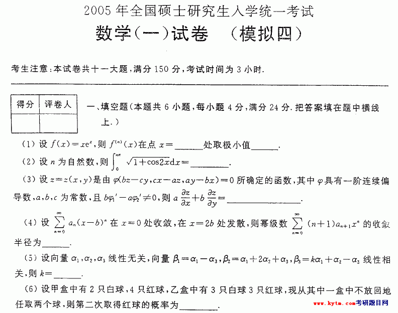 2005年合肥工业大学数学模拟试题数学一试题第四集