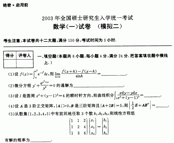 2003年合肥工业大学冲刺辅导模拟试卷数学一试题模拟二