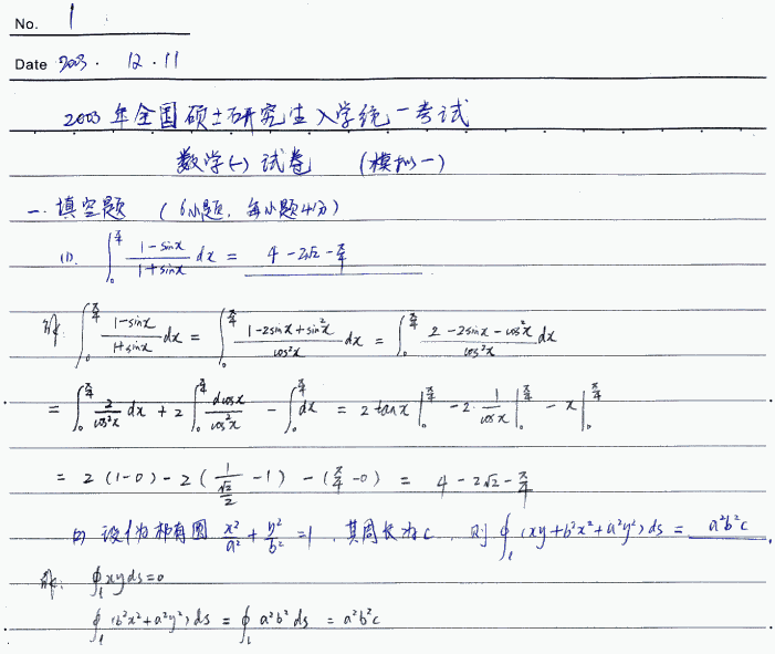 2003年合肥工业大学冲刺辅导模拟试卷数学一试题模拟一详细答案