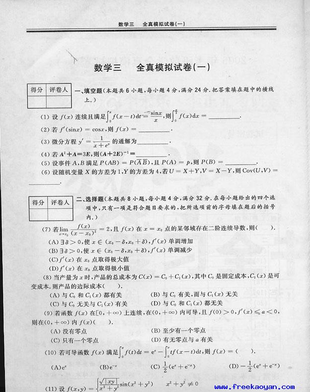 文都数学全真模拟试题及答案(数三)1