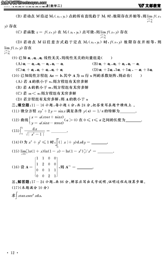 2007考研数学考前必做三套题(数学二试卷二)(2)