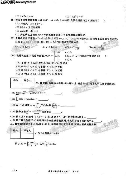 2007年硕士研究生考试数学最后冲刺试卷(四)(6)