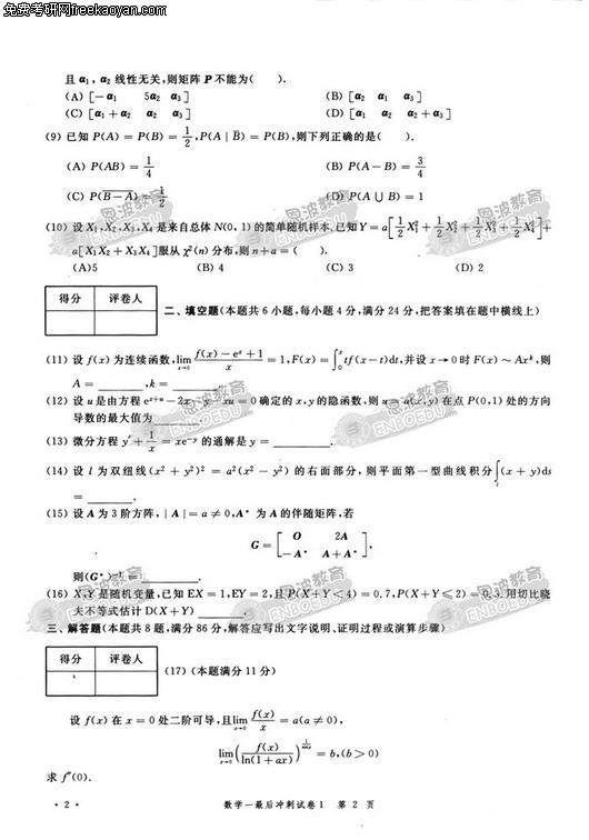 2007年硕士研究生考试数学最后冲刺试卷(一)