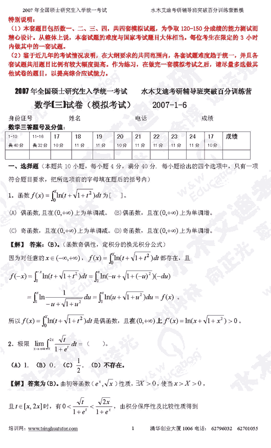 2007年硕士研究生入学考试数学(三)模拟试卷