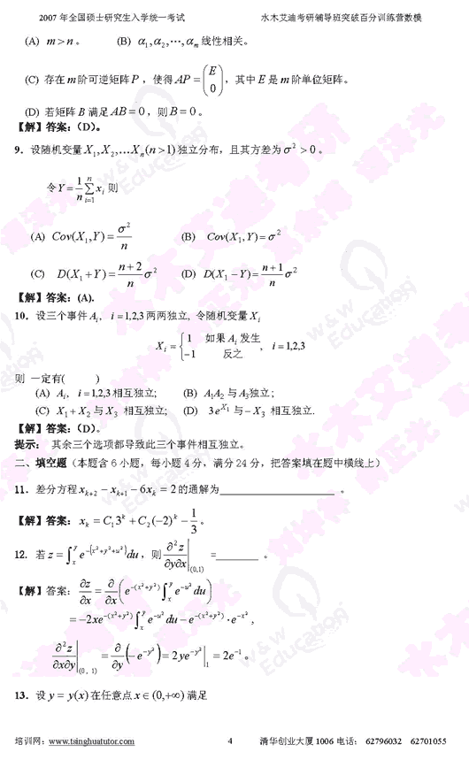 2007年硕士研究生入学考试数学(三)模拟试卷(4)