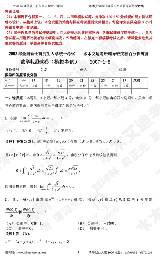2007年硕士研究生入学考试数学(四)模拟试卷