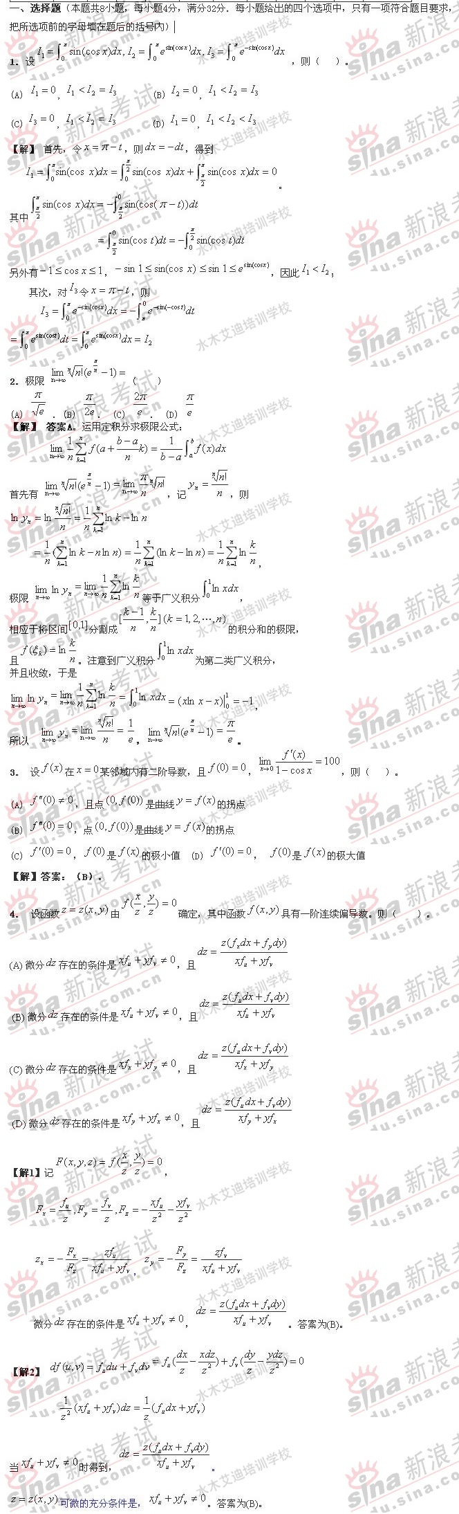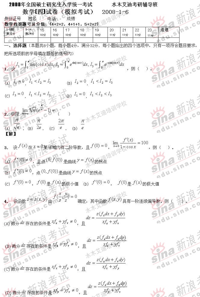 水木艾迪08考研数学(四)押题试卷及参考答案