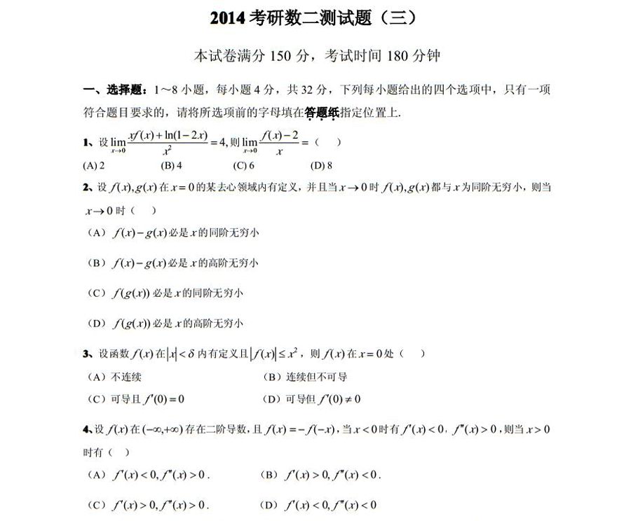 距离2014年研究生考试还有最后几天。新浪小编整理了2014年考研[微博]冲刺阶段《数学一》模拟题,希望对备考的你有所帮助。 ...