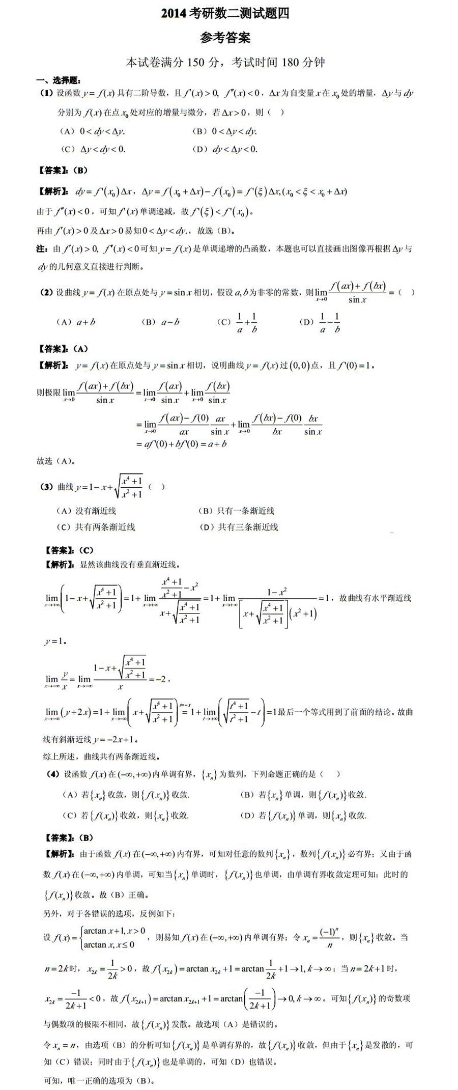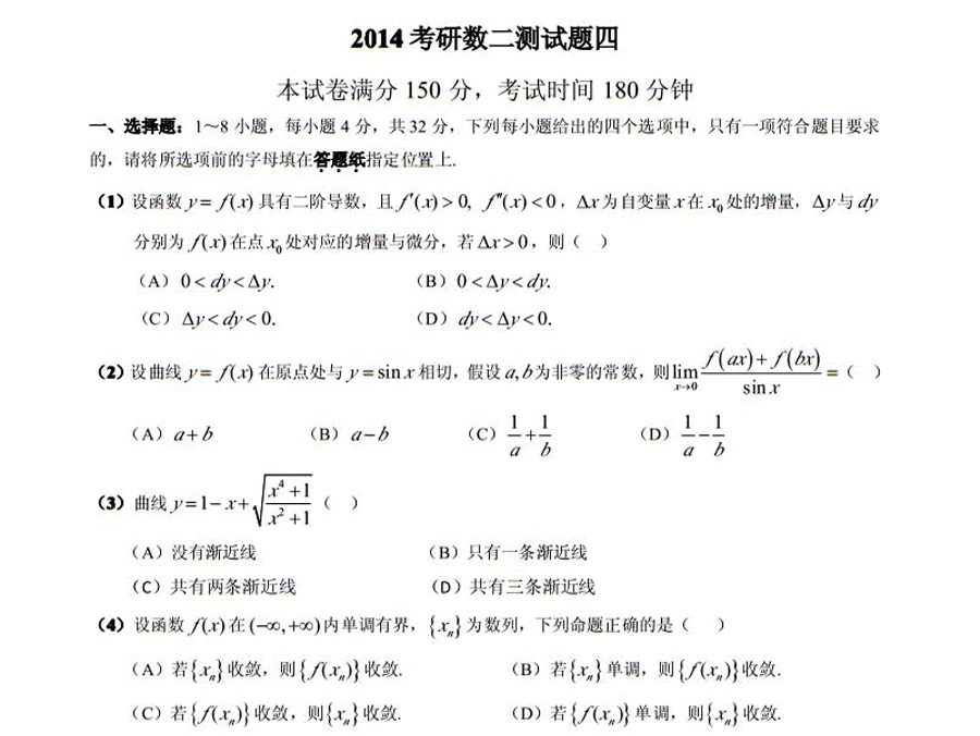 跨考教育2014年考研《数学二》模拟试题及参考答案(四)