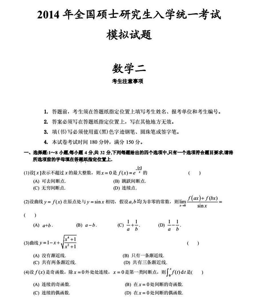 距离2014年研究生考试还有最后几天。新浪小编整理了2014年考研[微博]冲刺阶段《数学一》模拟题,希望对备考的你有所帮助。 ...