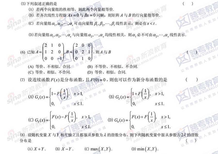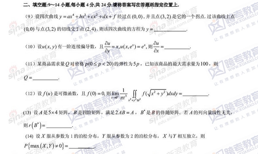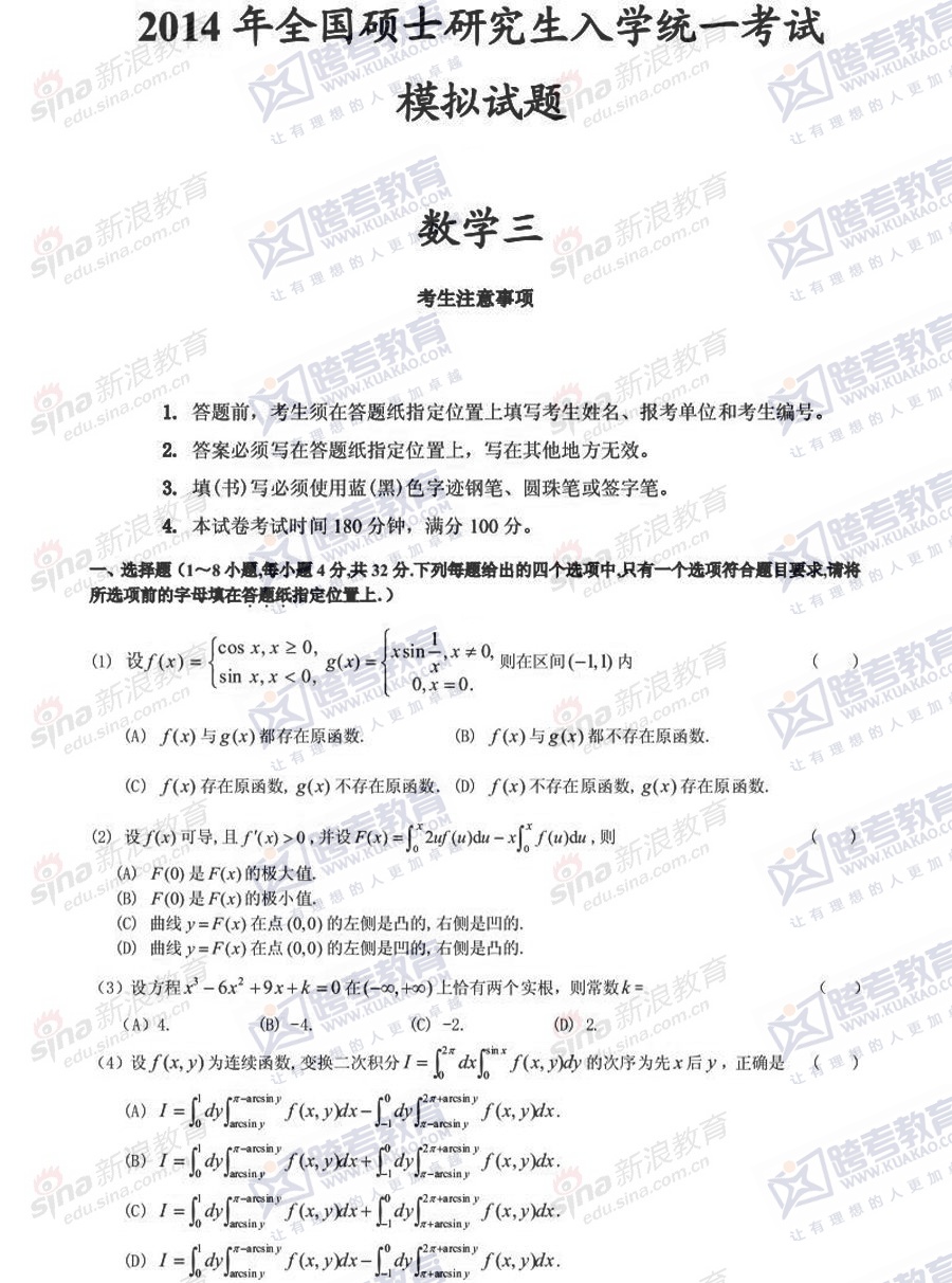 距离2014年研究生考试还有最后几天。新浪小编整理了2014年考研[微博]冲刺阶段《数学二》模拟题,希望对备考的你有所帮助。 ...