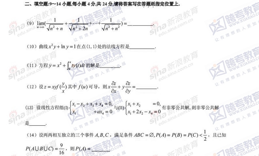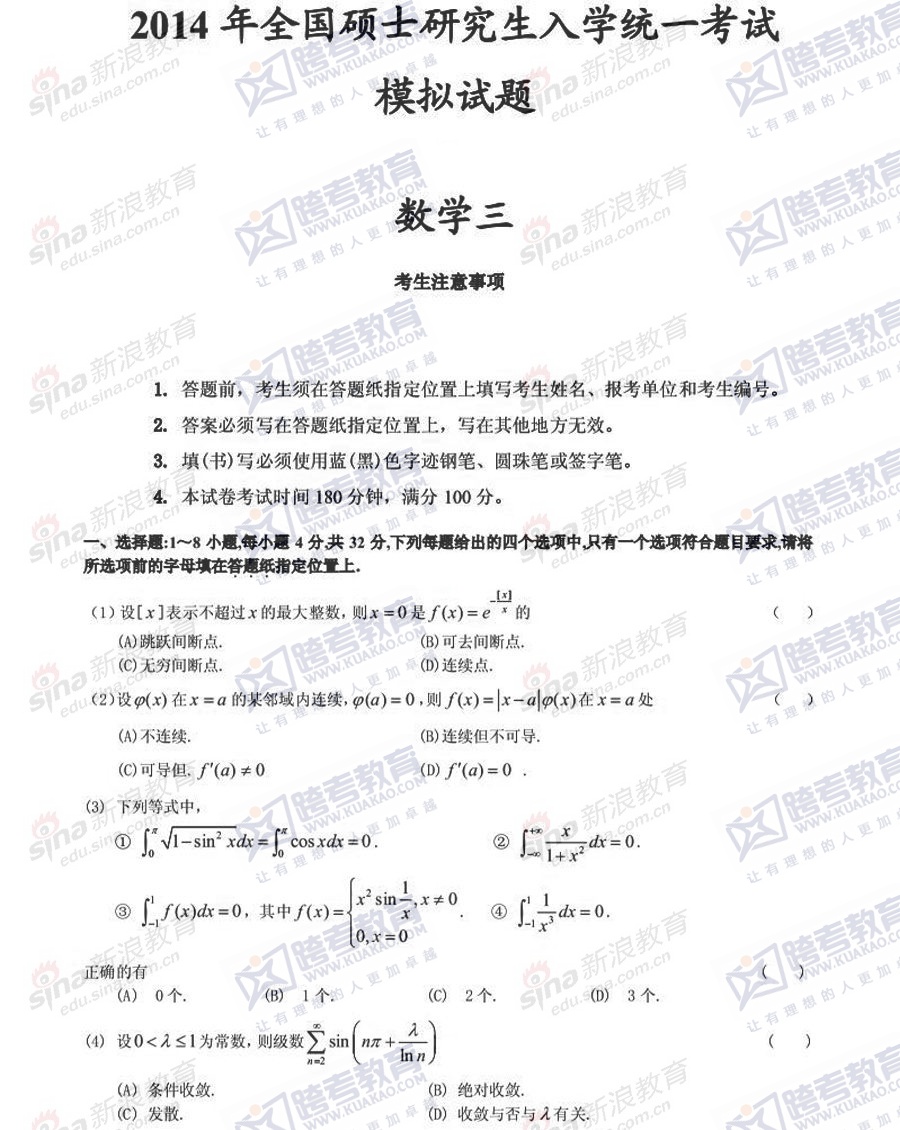 距离2014年研究生考试还有最后几天。新浪小编整理了2014年考研[微博]冲刺阶段《数学二》模拟题,希望对备考的你有所帮助。 ...