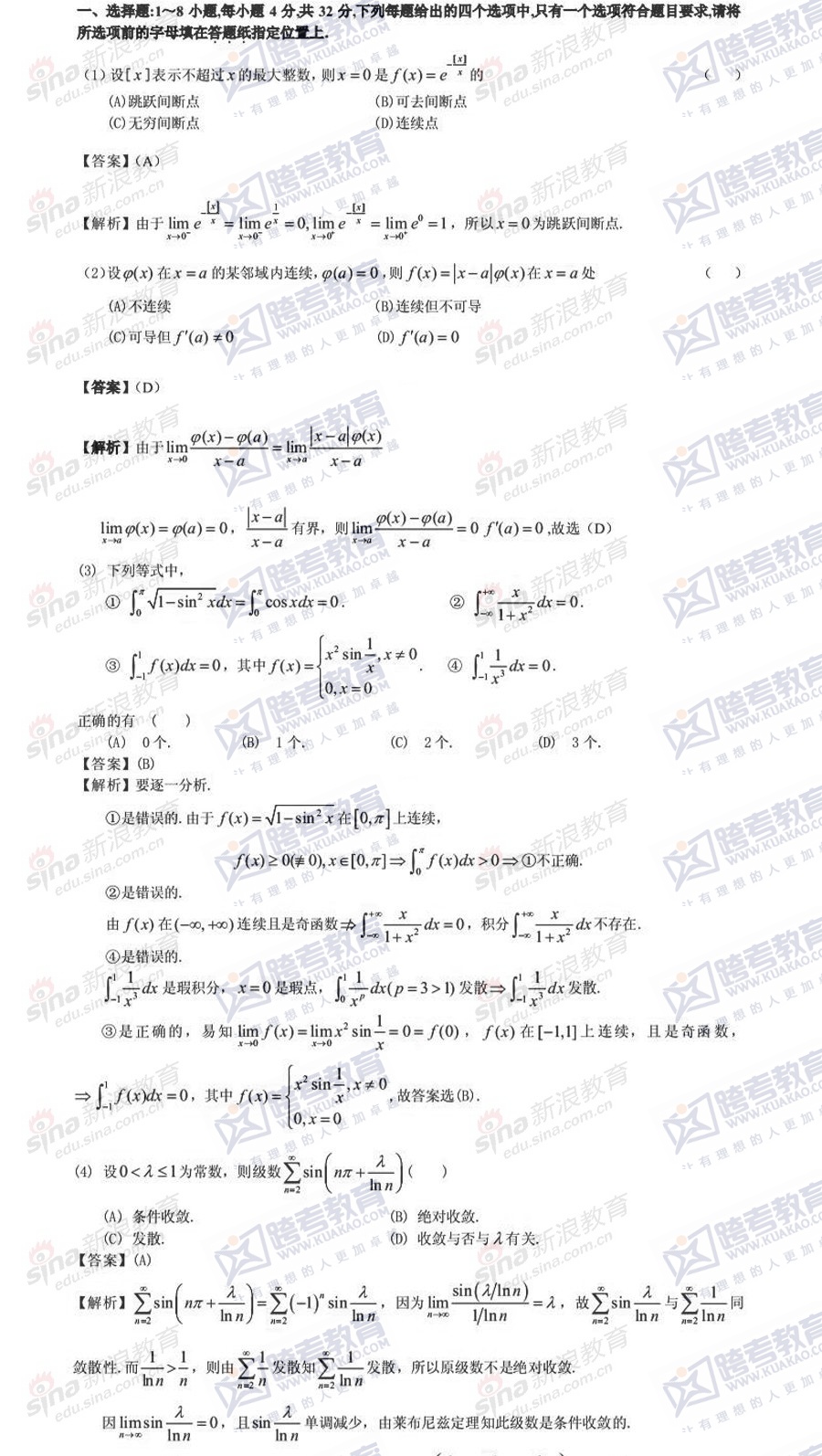 跨考教育2014年考研《数学二》模拟试题及参考答案(八)
