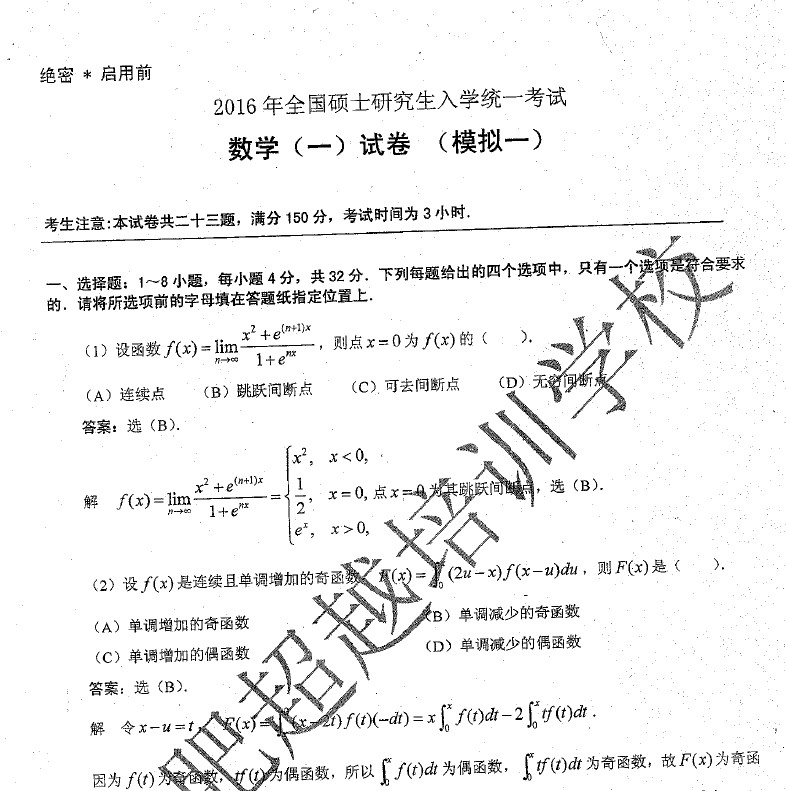 数学资料 本站小编 免费考研网 2015-12-142016考研数学合工大超越数学一i模拟题(五套卷)