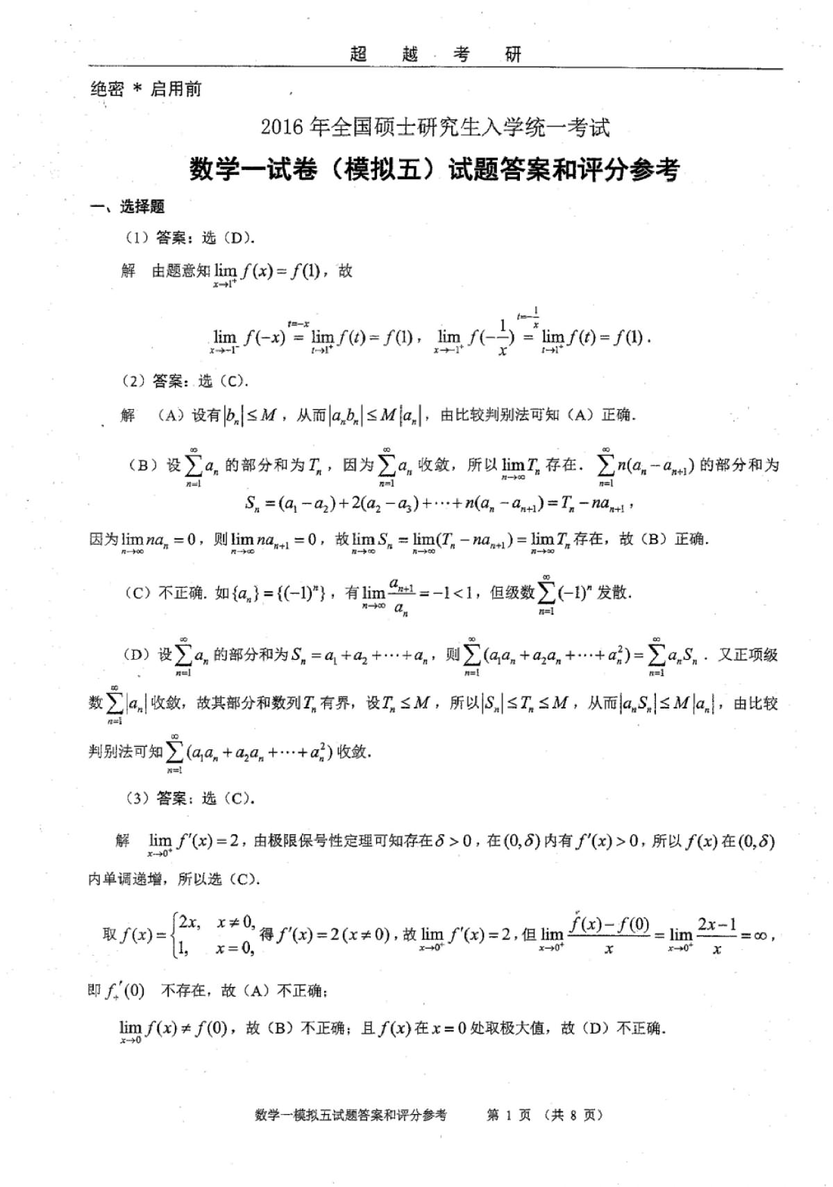 2016年考研合工大数一五套卷答案完整版(38)