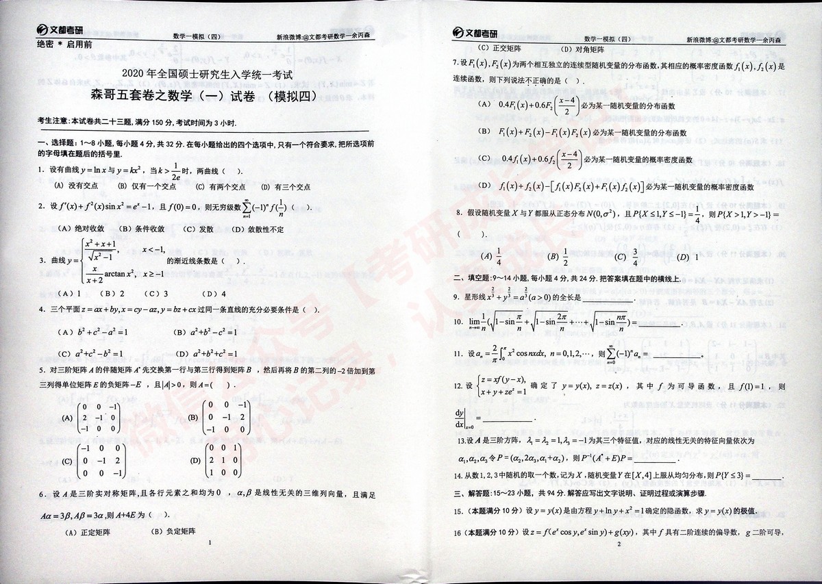 2020合工大森哥五套卷习题与答案考研数学一(7)