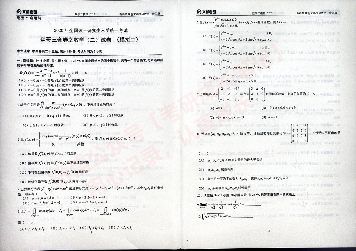 2020合工大森哥五套卷习题与答案考研数学二(3)