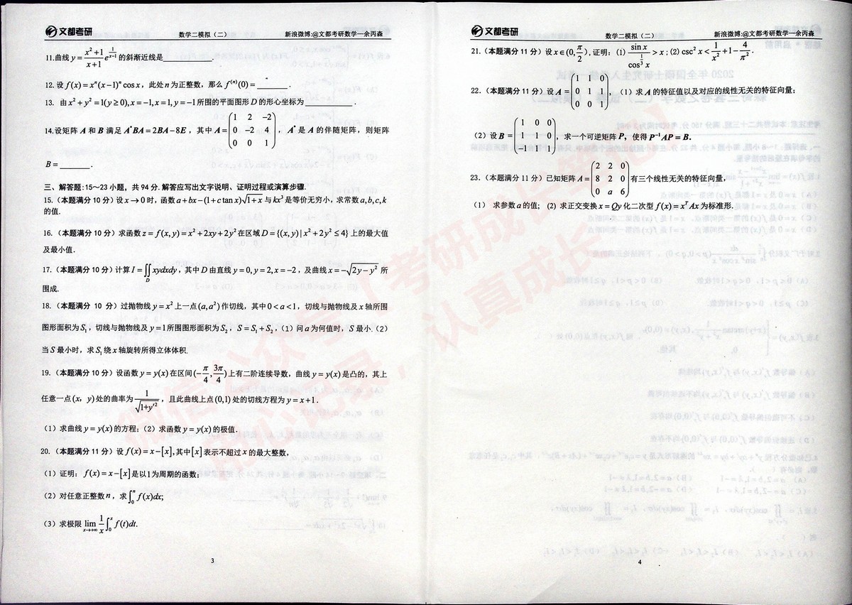 2020合工大森哥五套卷习题与答案考研数学二(4)
