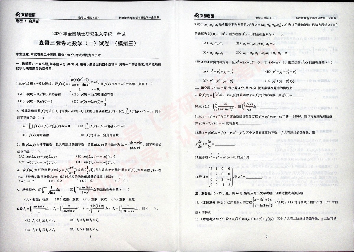 2020合工大森哥五套卷习题与答案考研数学二(5)