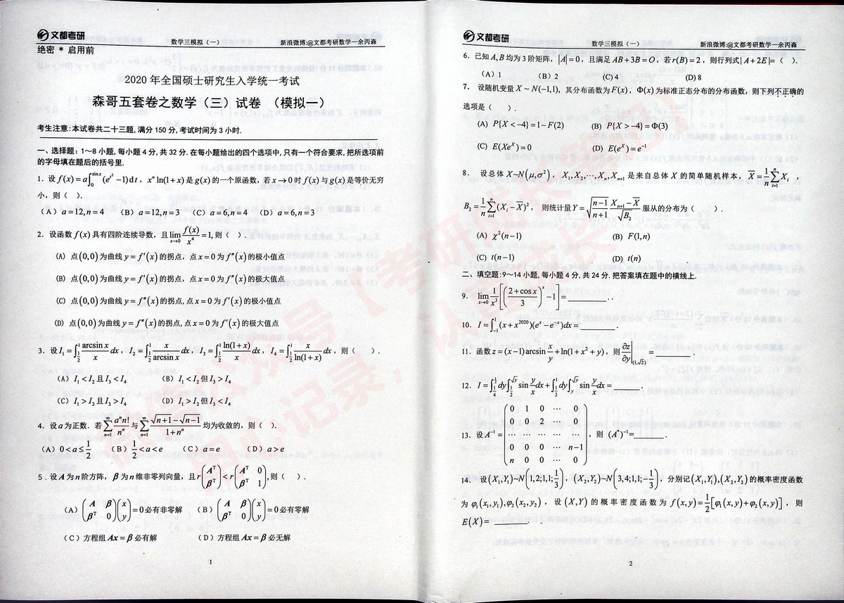 2020合工大森哥五套卷习题与答案考研数学三