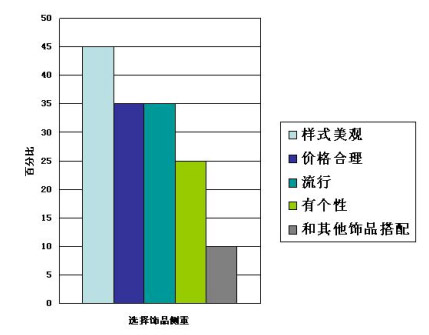 消费者在选择饰品的时候,会在很大程度上考虑它的来源地。从上面的相对比例图可以看出,来自韩国和日本的饰品占据明显的优势。近年来,歌曲、影视剧、时装韩流轮番袭来,带动韩国流行元素产品备受中国消费者的青睐。在这种背景下,来自韩国、日本等国的产品纷纷进入中国市场以获取品牌的持续发展。拥有遍布全球一百多家分支机构、一万余家终端店的韩国朴秀秀饰品集团在对中国饰品市场进行了为期一年的仔细调研和试运营后也正式进入中国市场,并与刘杰克营销顾问机构强强联手,力争在最短时间内通过商场连锁及加盟店连锁体系将朴秀秀优质低价的产品覆盖到中国各地。