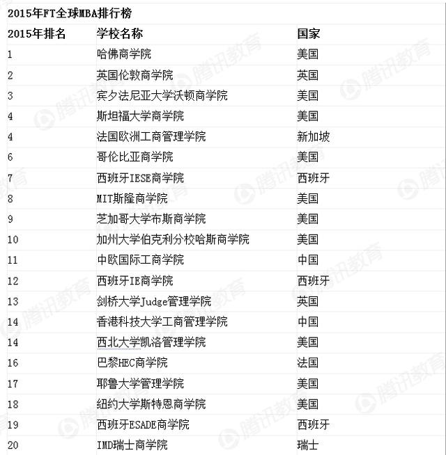 2015年FT全球MBA排名出炉,哈佛商学院击败所有 竞争对手,仍稳夺冠军宝座。这是哈佛商学院第六次荣登榜首,也是连续第三年蝉联冠军。英国伦敦商学院位列第二,宾夕法尼亚大学沃顿商学院位列第三。中欧国 际工商学院MBA课程为亚洲商学院第一,排名全球第11位;上海交大安泰经管学院与复旦经管学院MBA项目为中国本土商学院之首。香港科技大学商学院、香 港大学、香港中文大学商学院位列第14、28和30位。