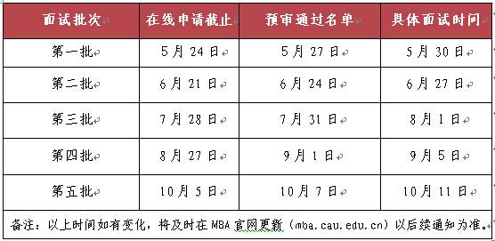 在招生流程上,继续秉承“公平、公正、公开、公信”的基本原则,严格依照以下流程进行预录取工作: 第一,通过提前面试按我校“自划B类分数线预录取”,旨在选拔潜在的投资家、创业家和高级职业经理人。提前面试分为优秀、良好、合格三个等级,相应录取政策如下; 第二,背景评估。根据考生提交的申请材料及其相关证明评估考生背景,最高可获10分附加分。背景评估内容主要包括教育背景、工作背景、外语(课程)水平、创业经历,海外工作或学习经历,地市级奖励,资格证书等。中国农业大学MBA教育中心组织专家评委评审考生背景材料,根据背景材料给予考生0-10分附加分。获得10分满分的考生如通过提前面试,成绩为“优秀”; 第三,为进一步选拔工作经验丰富,具备较强实战能力的考生,减轻考生压力,通过提前面试获得优秀、良好成绩的考生预录取资格保留2年(只针对第一志愿报考我校的考生)。若第二年国家招生政策有变化,则预录取资格保留考生的录取政策做相应调整; 第四,提前面试中着重关注考生在投资、批判式思维、综合素质等方面的考核,加大面试成绩在最终总成绩中的比重。录取综合总成绩中,初试联考成绩占40%,提前面试或复试成绩占60%。 二、提前面试申请条件 (一)申请条件: 1.拥护中国共产党的领导,愿为社会主义现代化建设服务,品德良好,遵纪守法; 获国家承认大学本科学历毕业后有三年或三年以上工作经验(2013年9月1日前获得本科毕业证书); 获国家承认大专学历毕业后连续工作五年或五年以上工作经验(2011年9月1日前获得专科毕业证书); 获硕士学位或博士学位,并有两年或两年以上工作经验(2014年9月1日前获得硕士或博士学位证书)。 2.身体健康并符合学校规定的体检标准。 (二)网上申请提前面试: 1.注册中国农业大学MBA报考服务系统。系统网址:http://mba.cau.edu.cn/teachsys/loginstudent.html注册时请注意确保证件号码和联系方式准确; 2.登录中国农业大学MBA报考服务系统,提交网上申请信息,信息内容必须真实有效,信息内容不完整的申请将不被评审; 3.网上申请成功后,中心将通知通过资格审核的考生参加提前面试。 三、提前面试流程安排: (一)面试提交资料及注意事项: 1.获得提前面试资格通知的考生须携带以下资料,以备资格审查 现场提交材料: 有效期内身份证原件及复印件; 学历证书、学位证书原件及复印件; 大 专学历考生需提交学历认证报告(2001年后毕业的考生可直接登录中国高等教育学生信息网(www.chsi.com.cn),进行学历在线验证查询。 2001年以前毕业的考生申请书面学历认证需要到国家学历认证中心现场提交申请材料认证,通讯地址:北京市海淀区北四环中路238号柏彦大厦506室(北 航北门向东200米); 最后学历成绩单复印件加盖红章(需要加盖档案所在地人事章或毕业院校红章); 个人简历。 背景评估材料(可选择):推荐信2封(模板链接)推荐人需在推荐信落款处手写签字,并装信封密封)、教育背景、工作背景、外语水平、创业经历、海外工作或学习经历、地市级奖励、资格证书等背景证明材料。 备注:按上述顺序排列,使用订书机将复印件左上角装订; 2.注意事项 根据高等教育招生考试收费标准的相关规定,每位考生收取面试费100元,请考生于资格审核当天现金交清; 考生提交的所有材料均需存档备案,考生不得以任何理由索回; 面试时请考生携带考试用笔,并请注意仪表,按时参加面试。 (二)面试具体安排及考核内容: 1.时间安排: 日期 时间 项目 5月30日 8:00——8:30 考生资格审核 8:45——9:45 笔试(政治、案例分析、英文写作) 10:00——12:00 英语(课程)口试测试 13:30——17:00 个人综合素质面试 2.考核内容: 科目 考试范围 形式 时间 英语口语测试 1.个人自我介绍:每人30秒; 分组进行 4人/组 12分钟 2.个人给定题目发言:1分钟准备,1分钟陈述; 3.无领导小组讨论:2分钟准备,3分钟讨论。 综合素质面试 对考生的工作背景进行考察,针对不同就读方向,着重考察学生信息索取能力、信息分析能力、逻辑判断能力、心理承受能力、职业操守、语言表达能力、沟通能力、领导力、应变能力、专业素质、实践能力及创新精神等综合能力评估。 个人面试 四、录取原则 1.提前面试成绩及最终录取将秉承“公平、公正、公开、公信”的基本原则,从流程上保障“四公”制度进行录取; 2.提前面试中获得有条件预录取(优秀、良好、合格)资格的考生联考成绩过我校自线B类分数线且在档案和申请材料审查真实性通过后,按成绩对应录取政策录取; 3.面试成绩不合格者不予录取。 五、面试要求: 1.考生应在规定时间内参加面试,不参加面试的考生,按自动弃权处理; 2.考生要遵守纪律,自觉听从工作人员的安排,遵守时间; 3.面试结束后,考生不得返回考场,不得在面试考场附近逗留、议论。 六、联系方式: 电话:010-62738516,010-62736561 地址:北京市海淀区清华东路17号