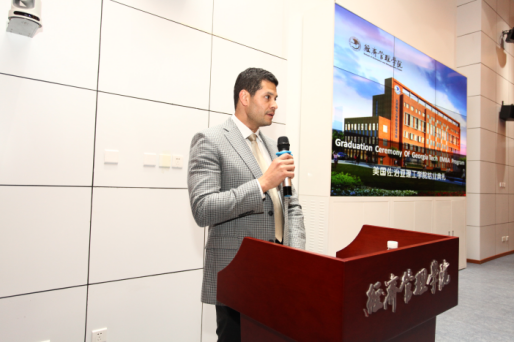 紧接着,毕业生Oscar Gross代表全体师生发言。Oscar首先对北京邮电大学的各位老师、志愿服务学生们的热情接待表示感谢。他说自己非常荣幸能够来北邮学习中国文化、中国企业、中国经商之道,也希望能够运用这次学到的知识去实现和中国企业更好的合作。