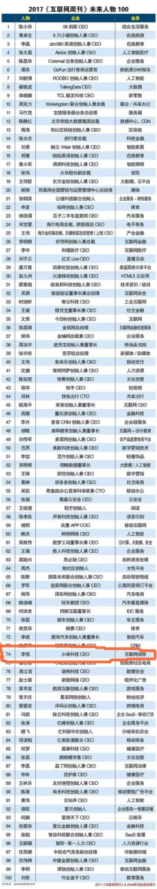 日前,国内知名的《互联网周刊》本着洞察企业发展动力,挖掘和传播优秀企业家的目标、使命和价值观,公布了“2017《互联网周刊》未来人物TOP100”。小保科技CEO李恒入选了此次公布的“未来人物TOP100”榜单,也是互联网保险行业的唯一入选者。