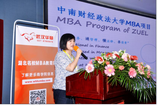 第一个上台展示的是2011年获得了AMBA国际权威管理教育体系认证、中国大陆第七家、财经类第一家获得该项国际认证的中南财经政法大学MBA学院,由王竞老师主讲。王老师针对中南财大的财商法优势特色、国际化、招生政策等进行了全面介绍。