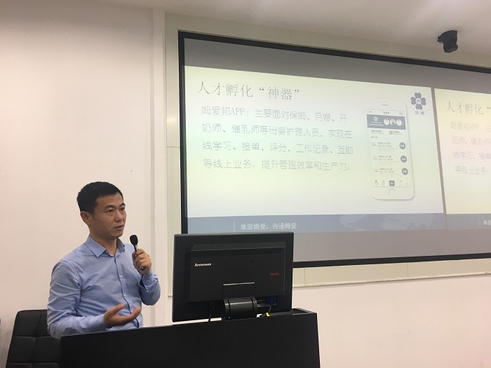 杨小明首先介绍了自己的创业公司——姆爱妇婴。姆爱公司于2016年1月注册于华东理工大学科技园,由上海市创业基金会资助成立。管理团队来自高端月子中心、妇儿医院、互联网等不同领域。专注为中高端母婴家庭提供“姆爱自营”月嫂等高品质母婴护理服务。在原广受客户认可的“自营月嫂”业务基础上不仅重资自建了母婴护理人才孵化中心,向广大母婴家庭提供更多优秀月嫂等母婴护理人才,还创新研发了月嫂住家陪护APP动态管控系统,用互联网连接月嫂、客户与公司,随时随地了解月嫂服务细节。持续为中产及以上群体提供优质月嫂陪护服务,并在行业标准输出、上游资源整合优化等多方面为行业改造升级做出了突出贡献,荣获上海市家庭服务业特别贡献奖和2017全球创业周中国站天使基金优秀项目“雏鹰奖”。
