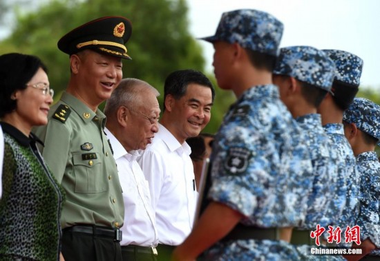 7月27日,第十届香港军事夏令营在解放军驻港部队新围军营举行结业典礼,260名香港中学生,结束了15天的军营生活,顺利结业。香港青少年军事夏令营由解放军驻港部队、香港特区政府教育局、香港军民同乐活动筹委会和德育关注组共同举办,目前已经连续举办了十届,共有大约2000名香港青少年学生参加。图为全国政协副主席董建华(左三)、香港特区行政长官梁振英(左四)、驻香港部队政委岳世鑫中将(左二)等出席结业典礼。中新社发 张宇 摄