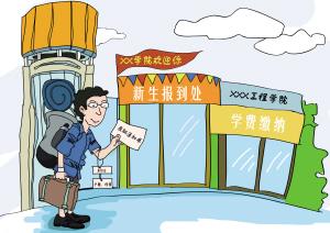 到达校门口后,一般就可以看到迎新的指示标志,根据自己所报专业找到本专业的报名点,报到时一般需要上交通知书、学籍档案、户口证明、身份证复印件、准考证等(每个学校不一样)。然后拿着报到证就可以去财务处或者指定缴费点缴学费,缴完学费就是办理住宿、食堂饭卡,采购日常用品。