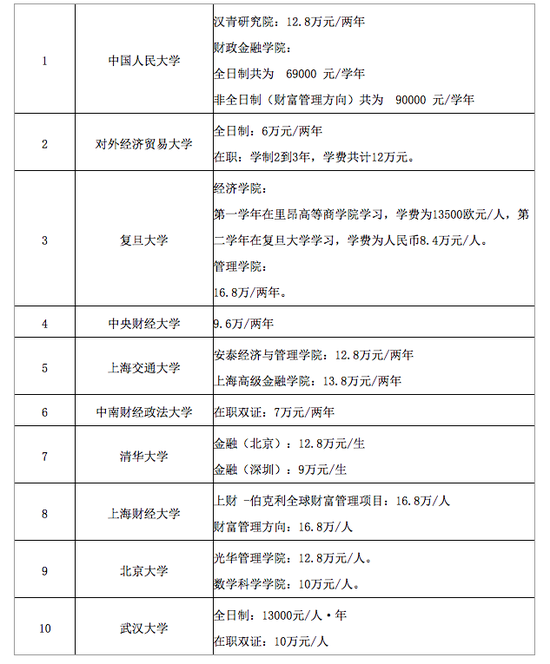 目前,金融硕士(MF)考研比较火热,很多同学争相报考,下面是中公考研为大家整理的部分热门院校金融硕士学费,供各位考生参考。
