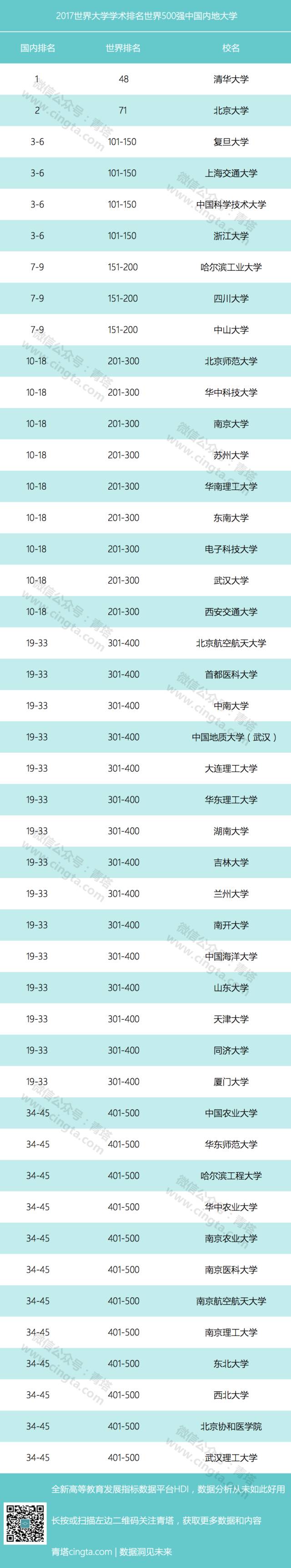 继2016年跃入世界百强后,清华大学今年再次取得突破,跻身世界前50,位列全球第48名,北京大学仍保持世界百强的位置。复旦大学、上海交通大学、中国科学技术大学和浙江大学四校均排在第101-150名。四川大学进步明显,首次入围世界两百强,电子科技大学和武汉大学由2016年的301-400名上升至世界第201-300名。