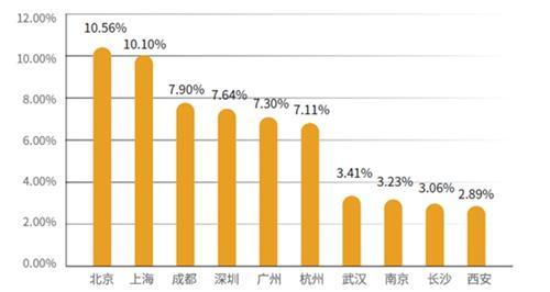 报告数据显示,求职热门城市排名中,前十位的城市依次是北京、上海、成都、深圳、广州、杭州、武汉、南京、长沙、西安。其中成都超过了深圳、广州等一线城市,成为了排名第三的求职热门城市。