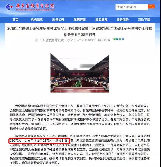 另据广东省教育考试院发布的消息,教育部林蕙青副部长作了讲话。她指出,2019年研招考试报考人数再次大幅增加,全国考生规模达到290万人,比去年增加了52万人,增幅21%。