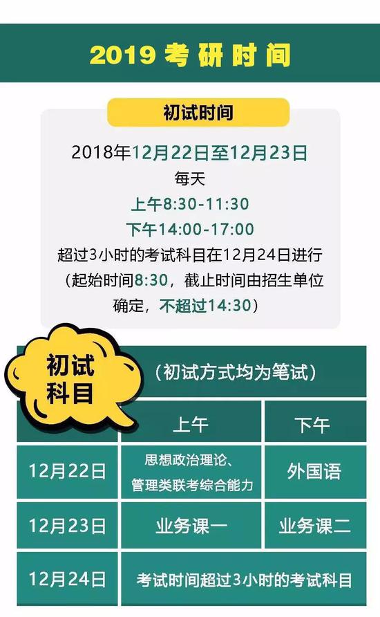 ■ 2019年考研初试的时间是:2018年12月22日-12月23日(超过3小时科目在24日进行)。
