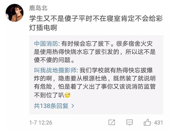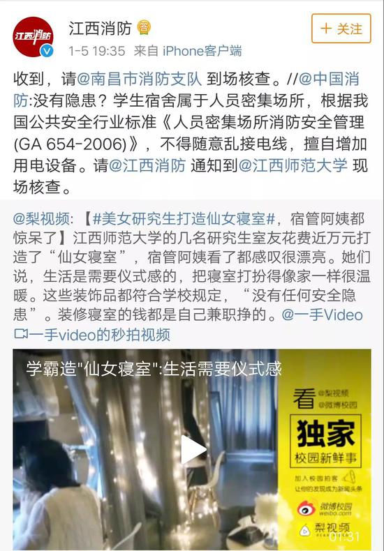 原来是,@中国消防 1月5日就发现了“仙女寝室”并表示:学生宿舍属于人员密集场所,根据我国公共安全行业标准《人员密集场所消防安全管理(GA 654-2006)》,不得随意乱接电线,擅自增加用电设备。请@江西消防 通知到@江西师范大学 现场核查。